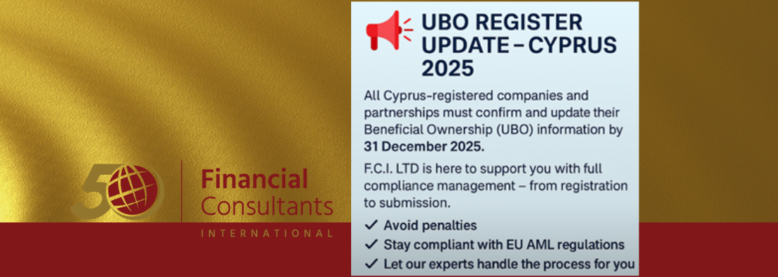 UBO Register Update 2025 Ενημέρωση για το Μητρώο Πραγματικών Δικαιούχων 2025 The Department of Registrar of Companies and Intellectual Property of the Republic of Cyprus has announced the mandatory annual confirmation of Beneficial Ownership (UBO) information for all companies and partnerships registered under the Cyprus Companies Law, Cap. 113. 📅 Submission Deadline: 31 December 2025🔗